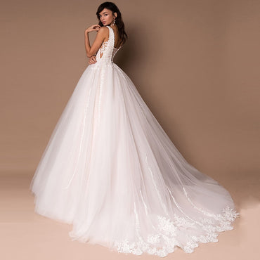 • Roycebridal Sexy V-neck Sleeveless Wedding Dresses Vestidos De Novia Custom Design Sleeveless Beading Applique Ball Gown Wedding Dress