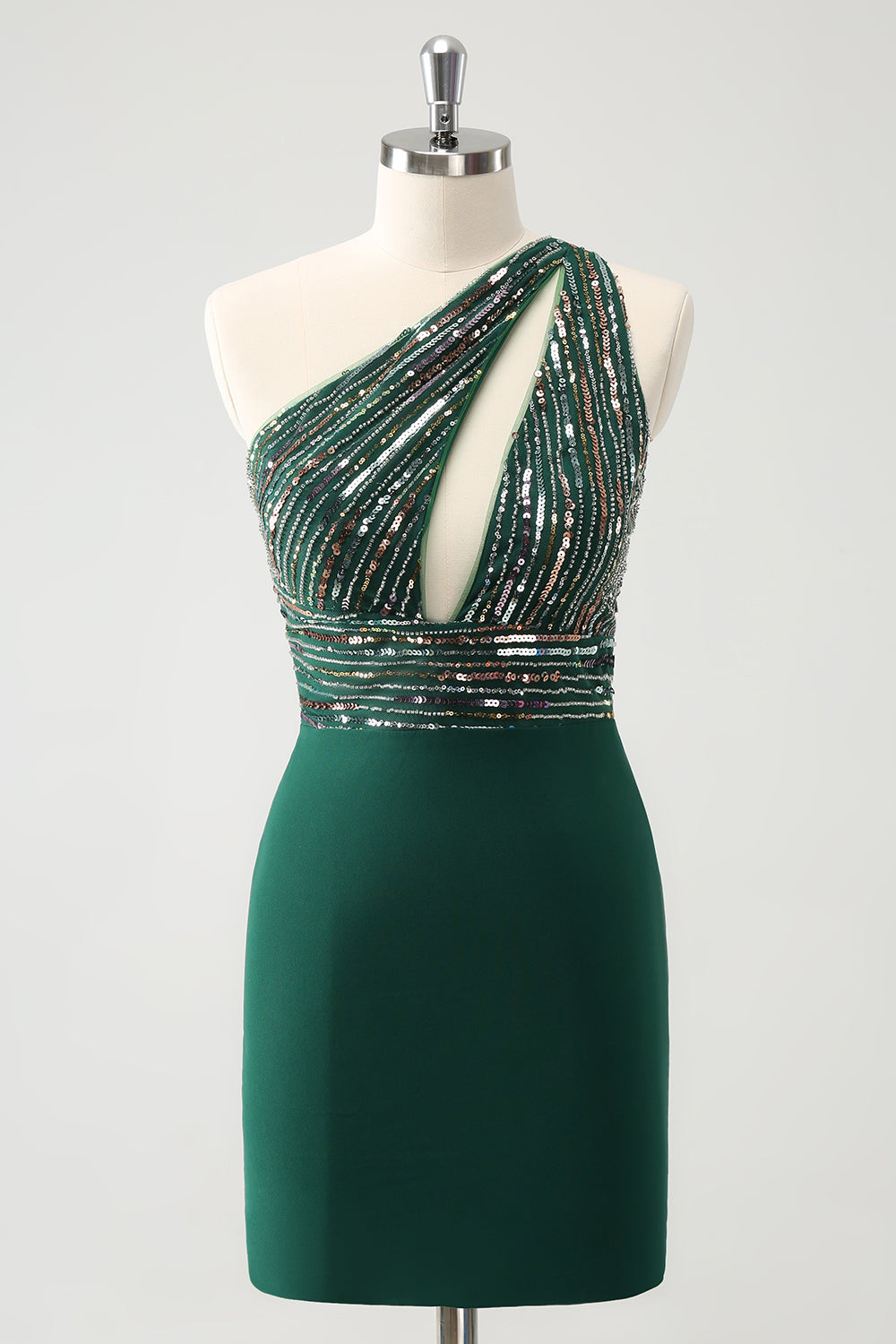 Sparkly Dark Green Bodycon One Shoulder Pleated Short Homecoming Dress with Sequins