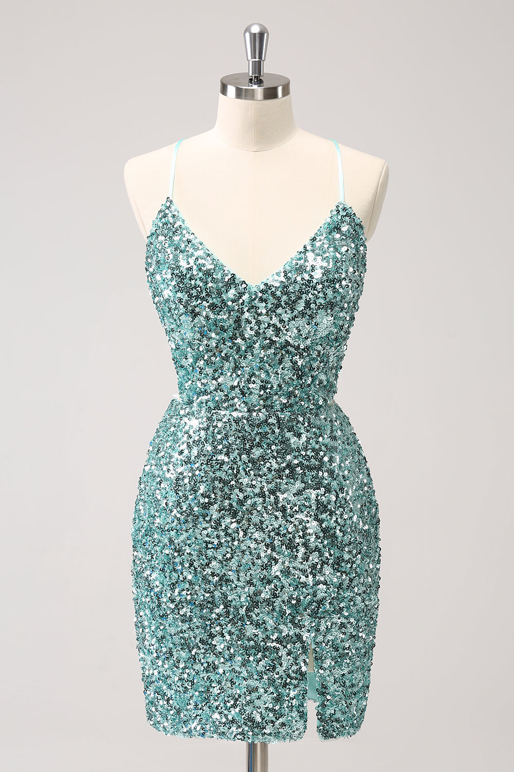 • Sparkly Blue Tight Lace Up Back Sequin Short Homecoming Dress with Slit