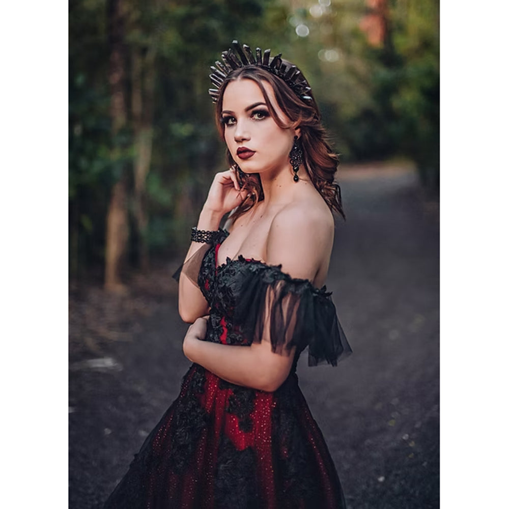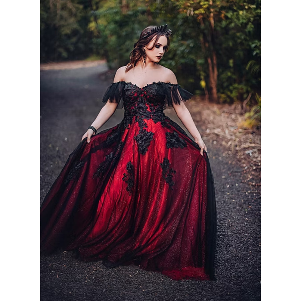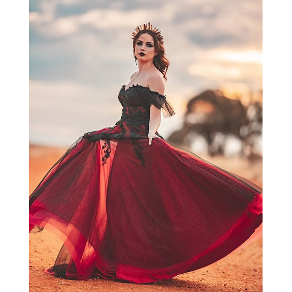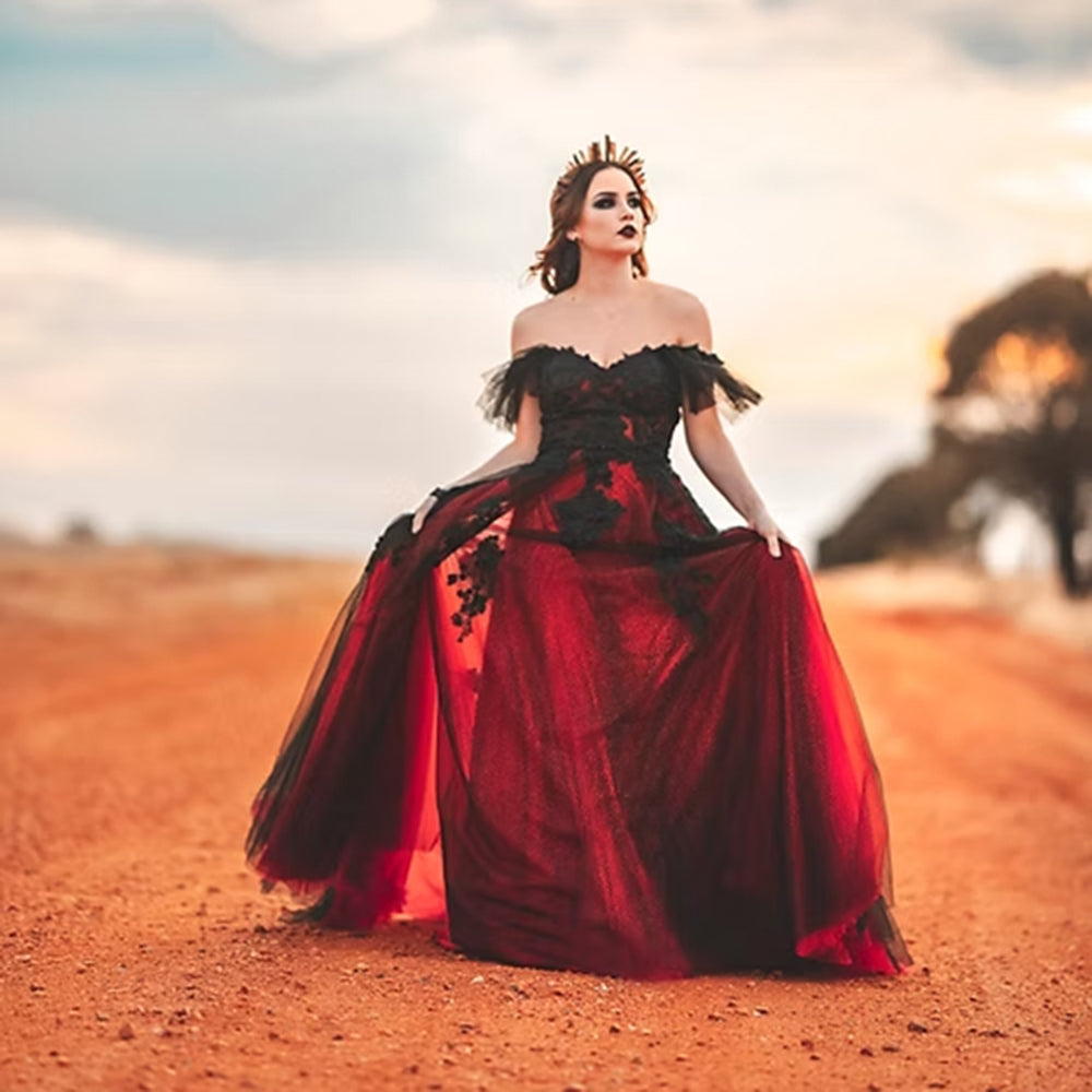 This striking red wedding dress combines a sexy sweetheart neckline with an off-the-shoulder design, highlighting the shoulders and collarbone elegantly. Made from intricate lace and flowing tulle, its A-line silhouette ensures a graceful fit, while the open back adds a daring gothic flair. Ideal for brides who want to make a bold, romantic statement on their wedding day.