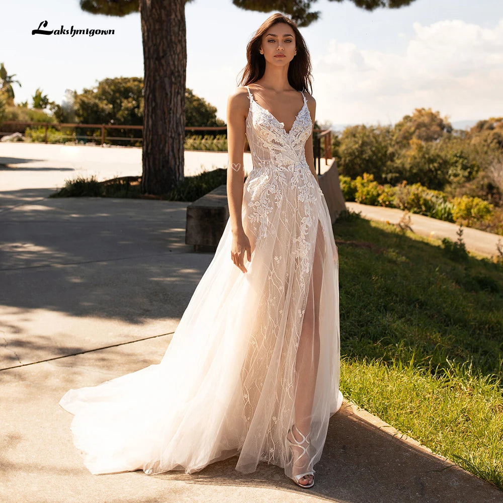 Roycebridal Boho Wedding Dress with slit Sexy Lace Appliques Backlesss Beach Bridals Dress Wedding Gowns Custom made vestido de novia