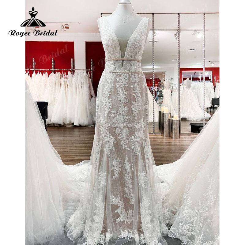 Roycebridal Deep V Neck Blush Pink Lace Appliques Boho Mermaid/Trumpet Wedding Dress for Women 2025 Luxury Vestido Civil robe mariée sirene