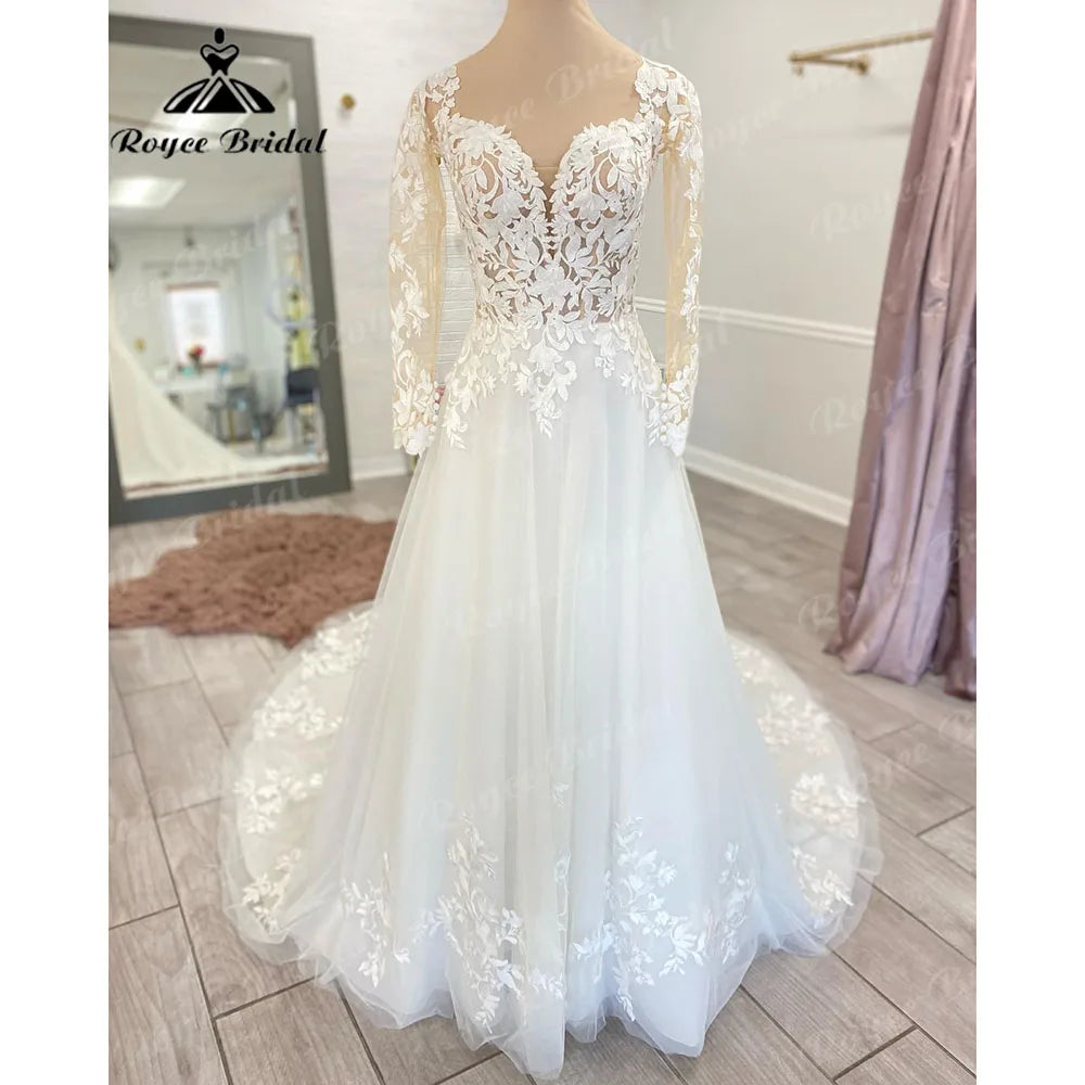 Roycebridal luxury Long Sleeve Flowers Lace Ball Gown Wedding Dresses Chic Appliques Beaded Cathedral Vintage Train Bridal Gowns Talla Gran