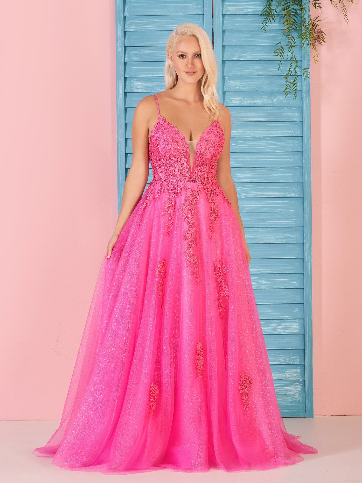 • Roycebridal Angelina | A Line V Neck Pink Lace Long Prom Dress