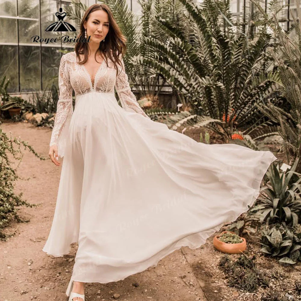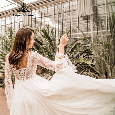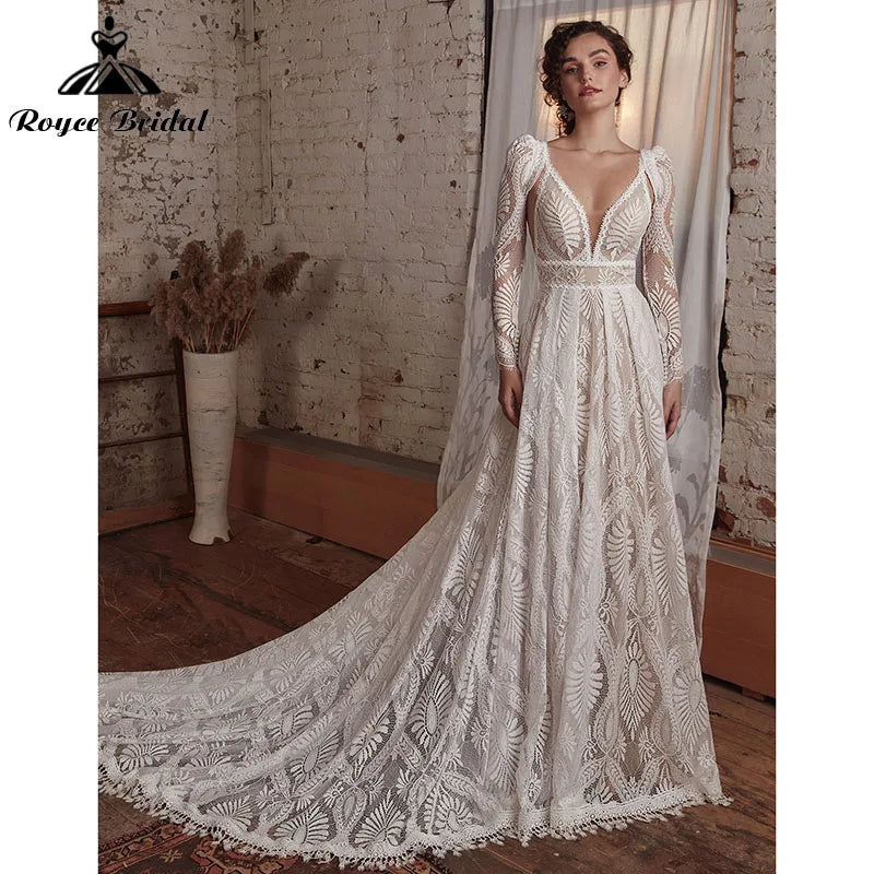• Roycebridal Boho Lace Long Sleeve Bridal Wedding Gown with V Neck Appliques Wedding Dress for Women vestido de fiesta de boda