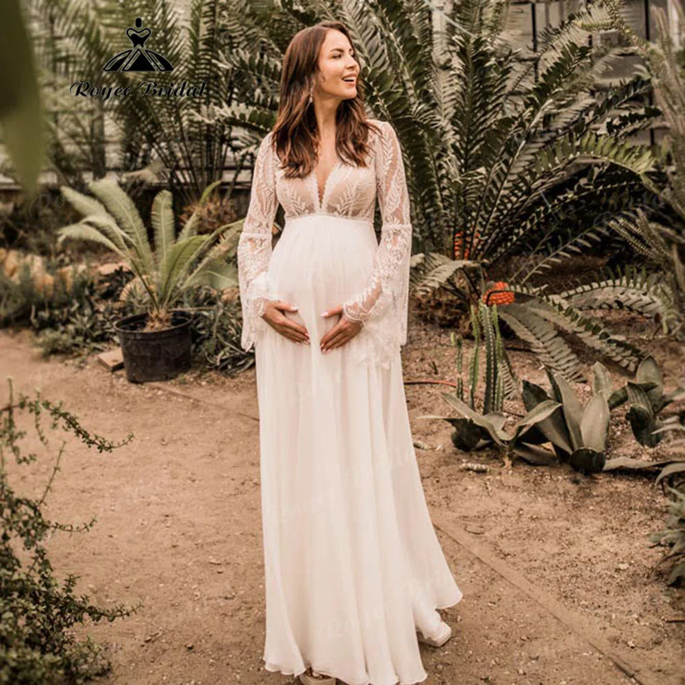 Maternity Long Sleeve Lace Chiffon Boho Wedding Dress for Pregnant Women