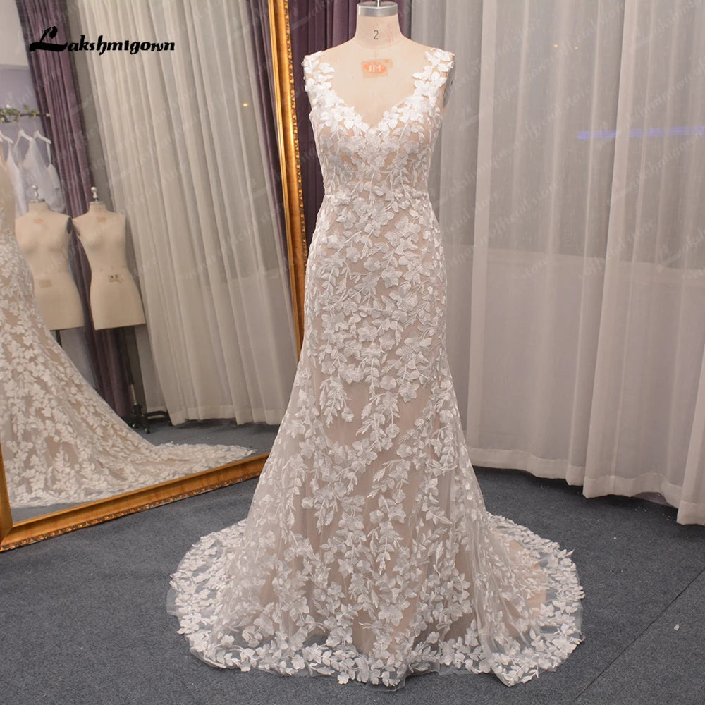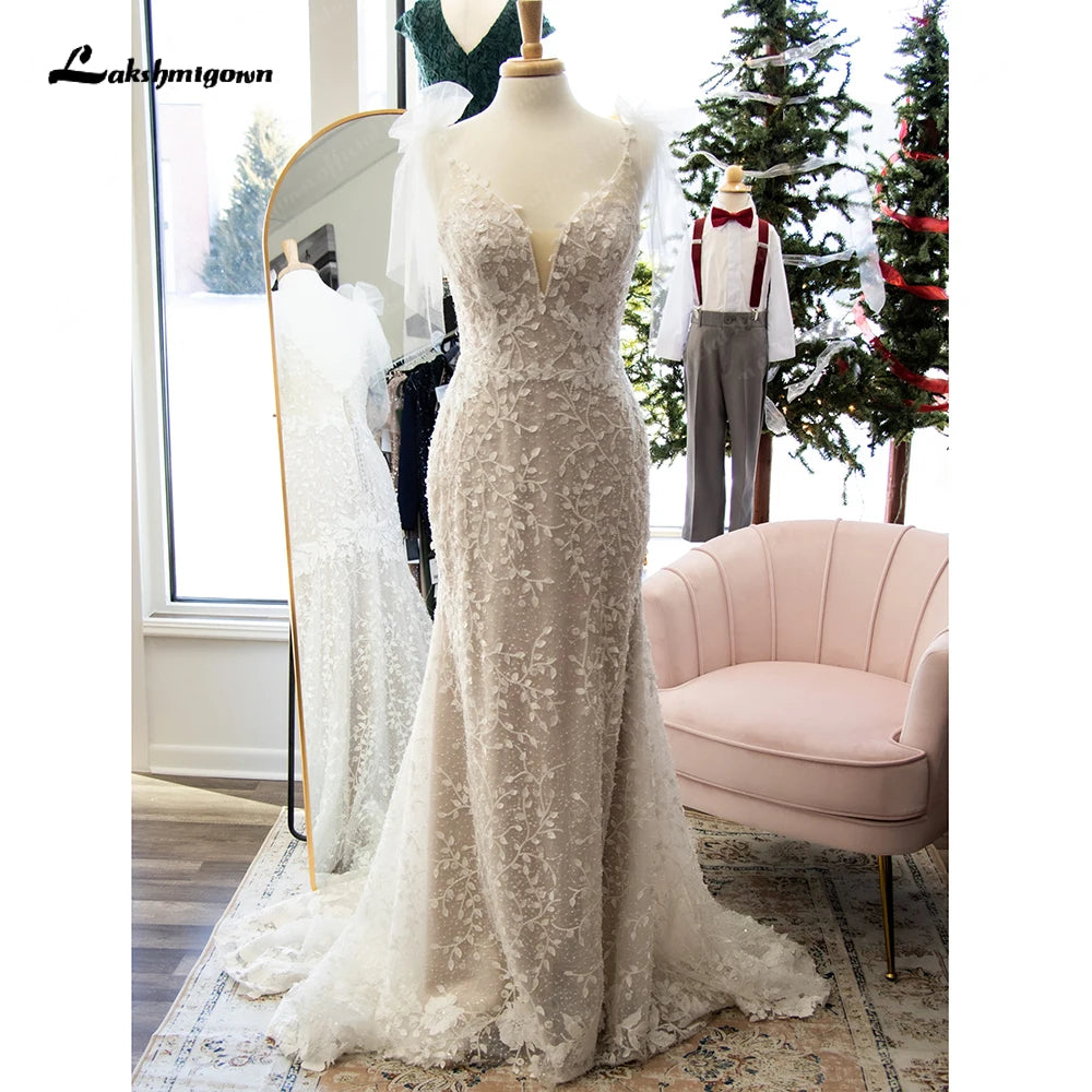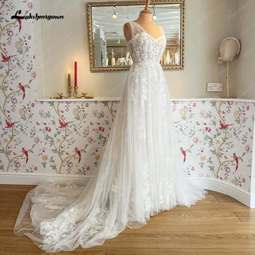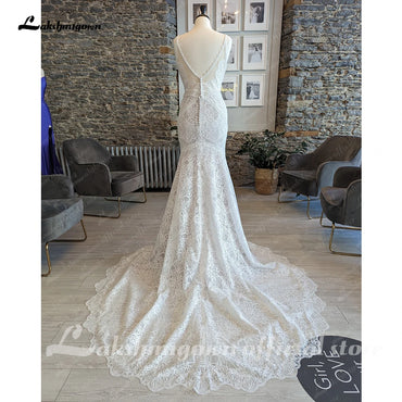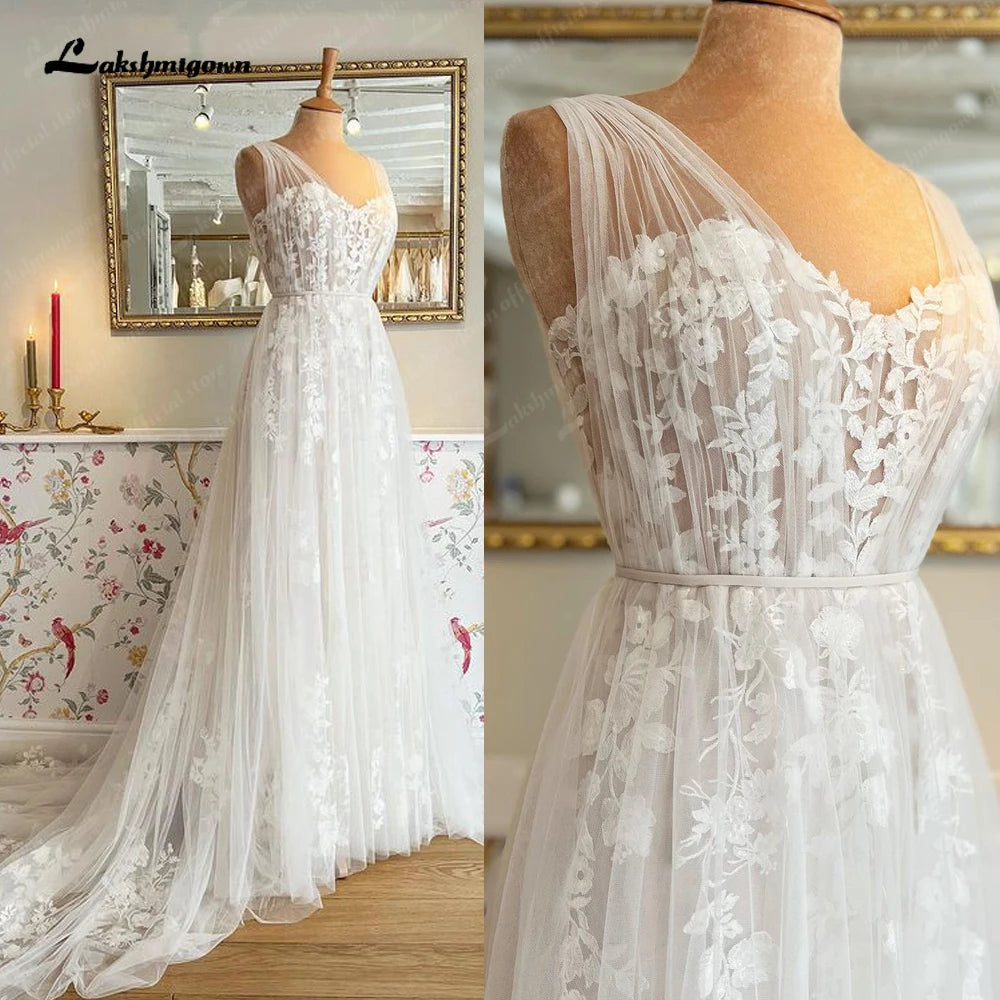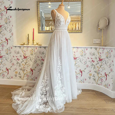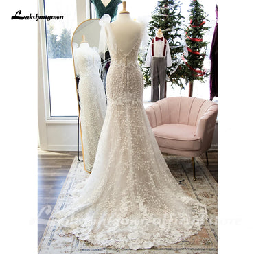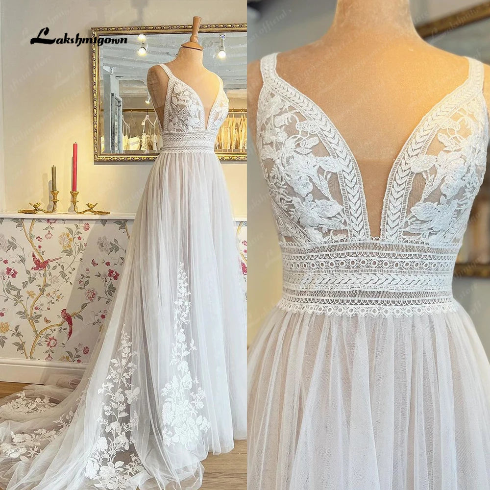 • Lakshmigown V Neck Sleeveless Wedding Dresses For Women Beads A Line Ivory Lace Romantic Bride Boho Bridal Gown Vestido De Noiva