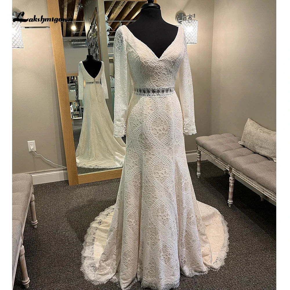 • Roycebridal Vintage Long Sleeve Lace Boho Civil Wedding Dress Bohemian Bridal Wedding Gown Custom Made Vestidos Novia