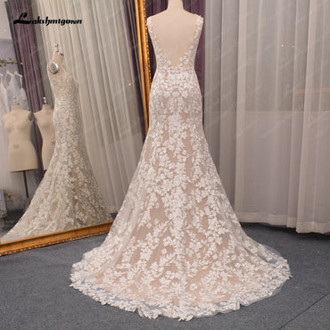 • Roycebridal Lace Mermaid Boho Open Back Wedding Dress with V Neck Boho Bridal vestido de boda corte sirena
