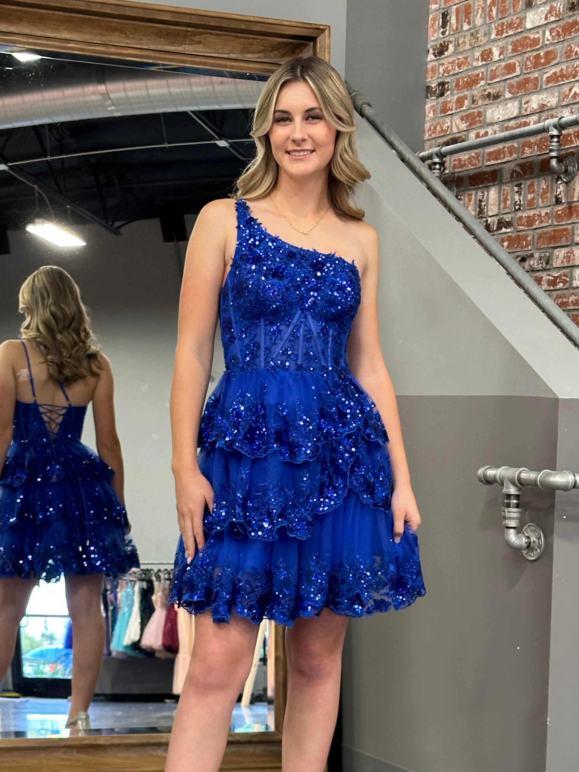 Emma | A Line One Shoulder Navy Tiered Lace Short Homecoming Dress