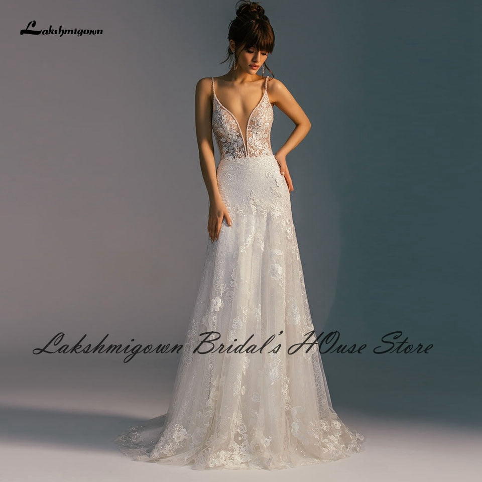Roycebridal Lakshmigown Sexy Bridal Robe Boho Wedding Dresses 2022 Robe Mariage Lace Appliques Sheer Illusion V neck A Line Wedding Dresses