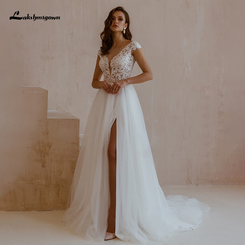 • Roycebridal Lakshmigown Sexy Boho Wedding Dresses with High Slit vestido de novia V Neck Lace Appliques Bridal Gown Robe De Mariee