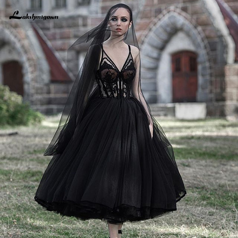 • Roycebridal Lakshmigown Gothic Black Wedding Dresses Backless A-line Bridal Dress Tea Length Deep V-Neck Lace