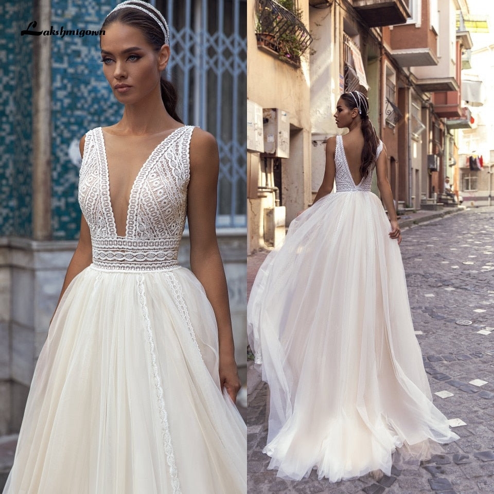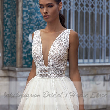 • Roycebridal Lakshmigown Sexy Boho Bridal Beach Wedding Dress 2021 Robes Sukienka A Line Wedding Dresses Lace Bodice Plunging Backless