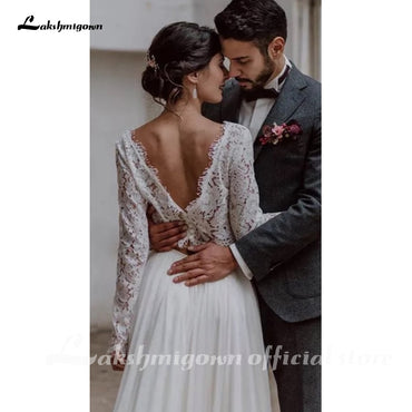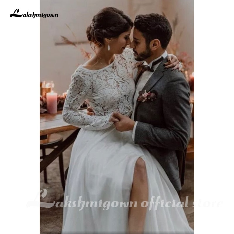 • Roycebridal Lakshmigown Wedding Dress Boho Bohemian Long Sleeve Two Pieces 2 Bridal Gown Soft Lace And Chiffon For Women Elegant Beach