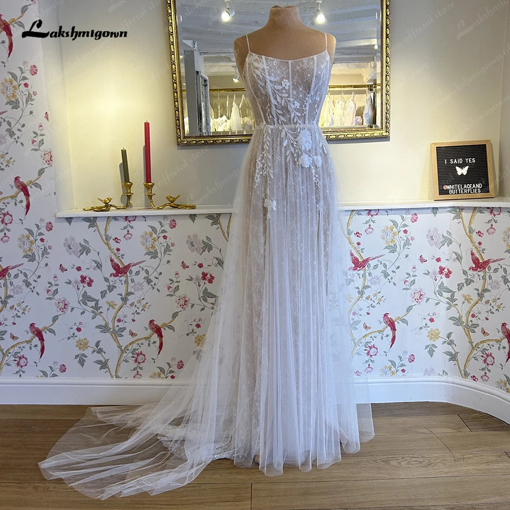 Roycebridal Split Side Lace Boho Women Wedding Dress for Bride Spaghetti Straps Wedding Gown batas de novia para