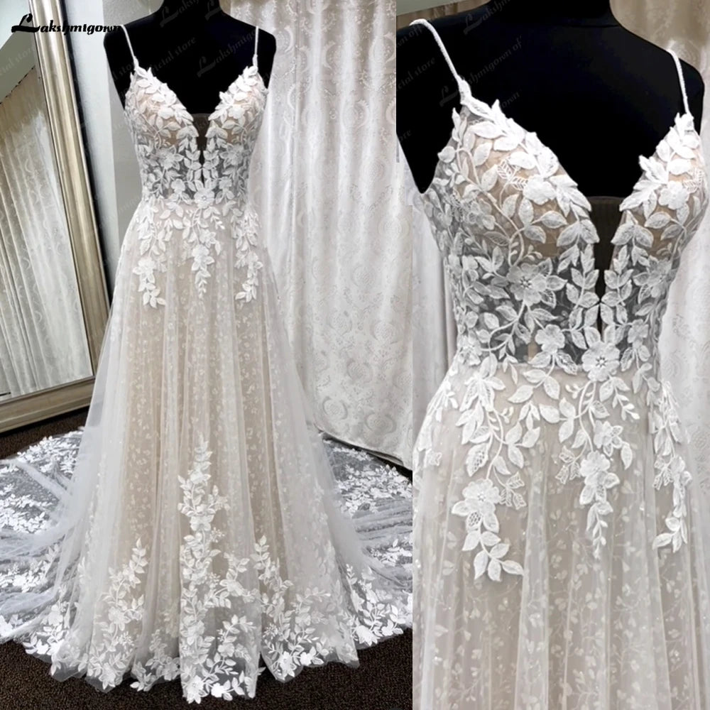 Roycebridal Deep V Neck Lace Floral Wedding Dress for Women 2024 Bridal Gown Champagne Backless Spaghetti Straps abito da sposa