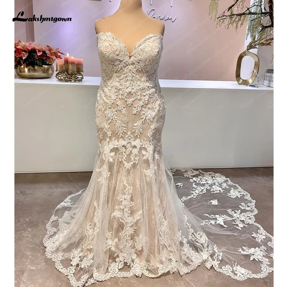 Roycebridal Mermaid Wedding Dress Elegant Vestido De Novia Satin Flowers Lace Bride Dresses Sheer Buttons Back