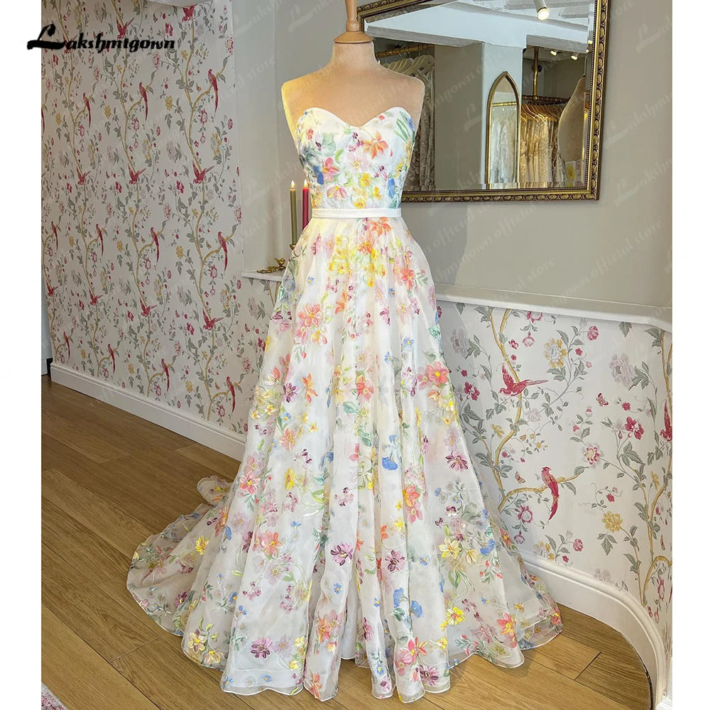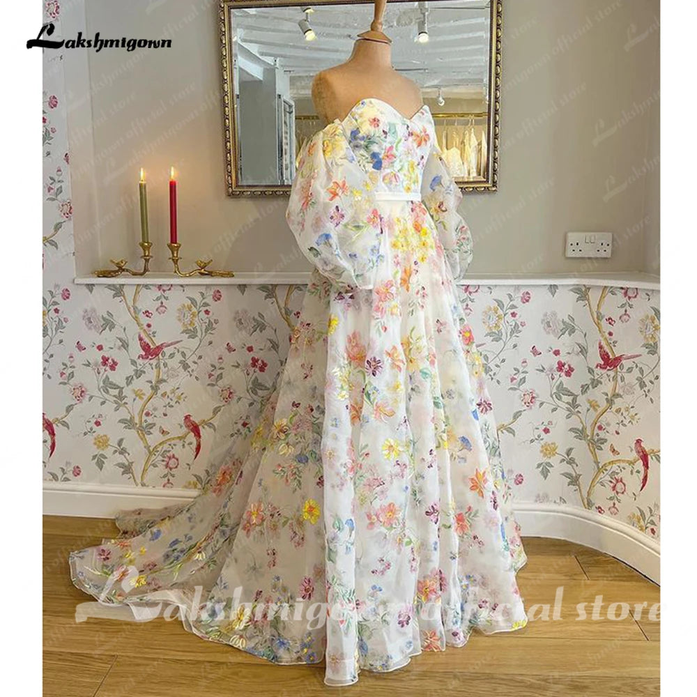 • Roycebridal Print Flower Wedding Dress with Detachable Puff Sleeve Sweetheart Off the Shoulder Boho Bridal Gowns estido de noiva