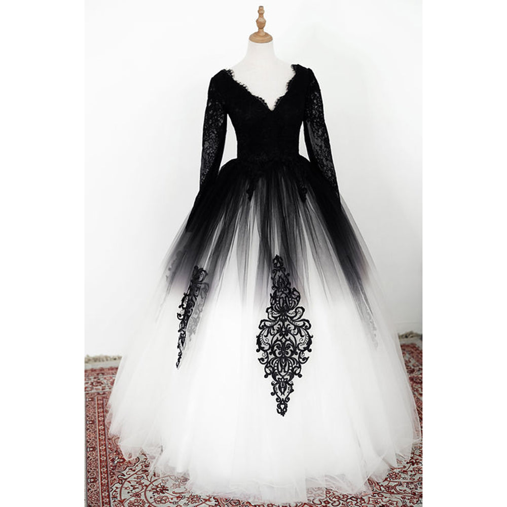 Description: This elegant black wedding dress features a flattering V-neckline and long lace sleeves, combining classic gothic style with modern...
