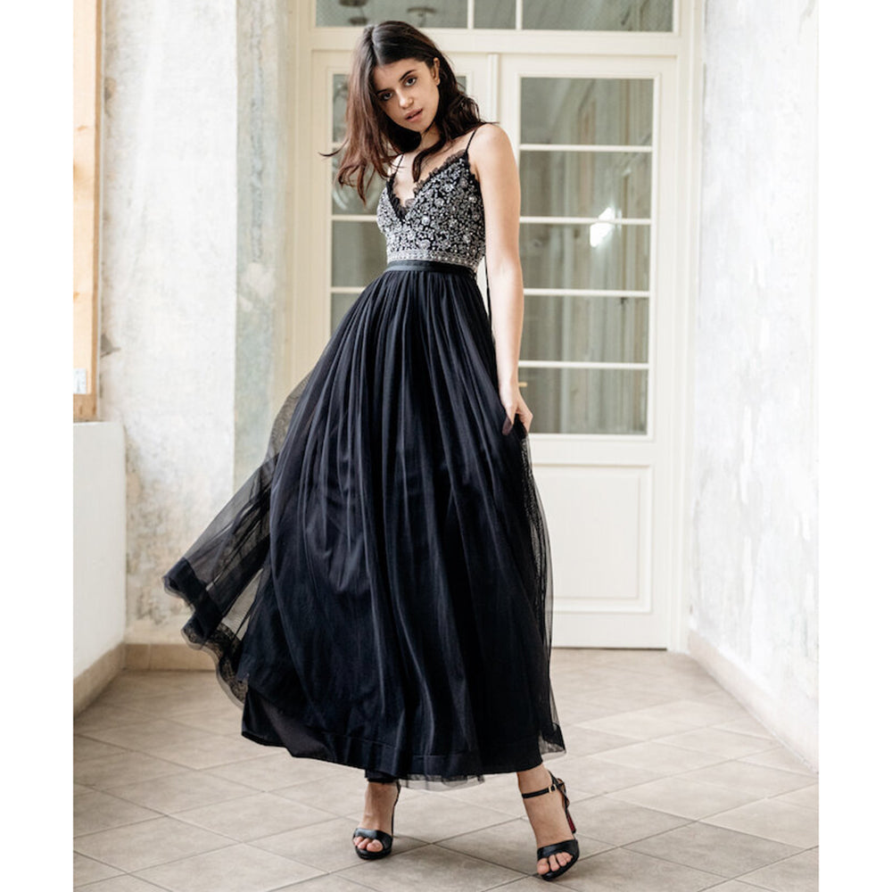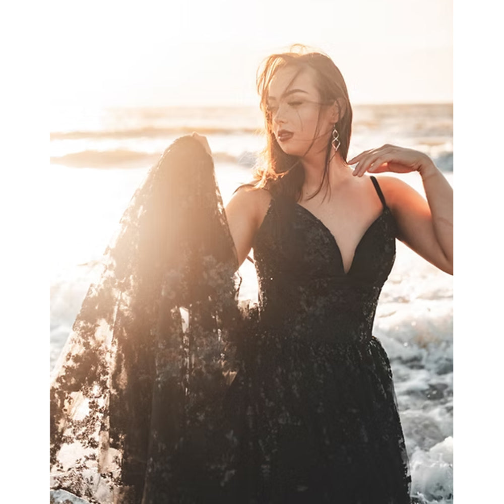 Description: This gothic-inspired black wedding dress features a seductive V-neckline and delicate spaghetti straps that enhance its elegant silhouette. The...