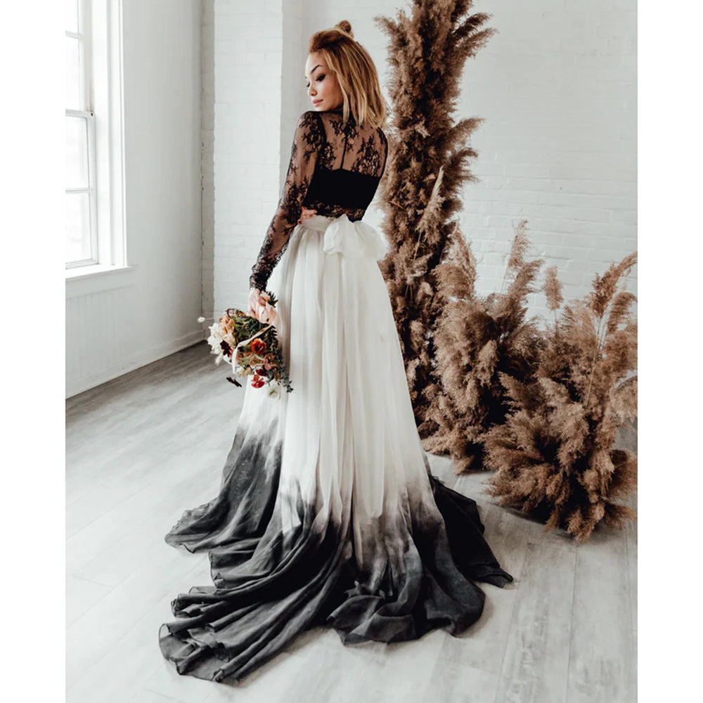 Elevate your bridal look with our O Neck Long Sleeve Lace Top Bow Back A Line Gothic Black Wedding Dress....
