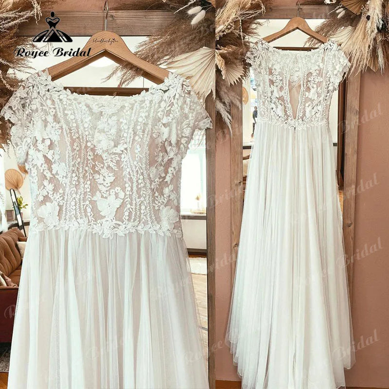 • Roycebridal Chiffon Bohemian Lace Wedding Dress A Line Lace Bridal Gowns