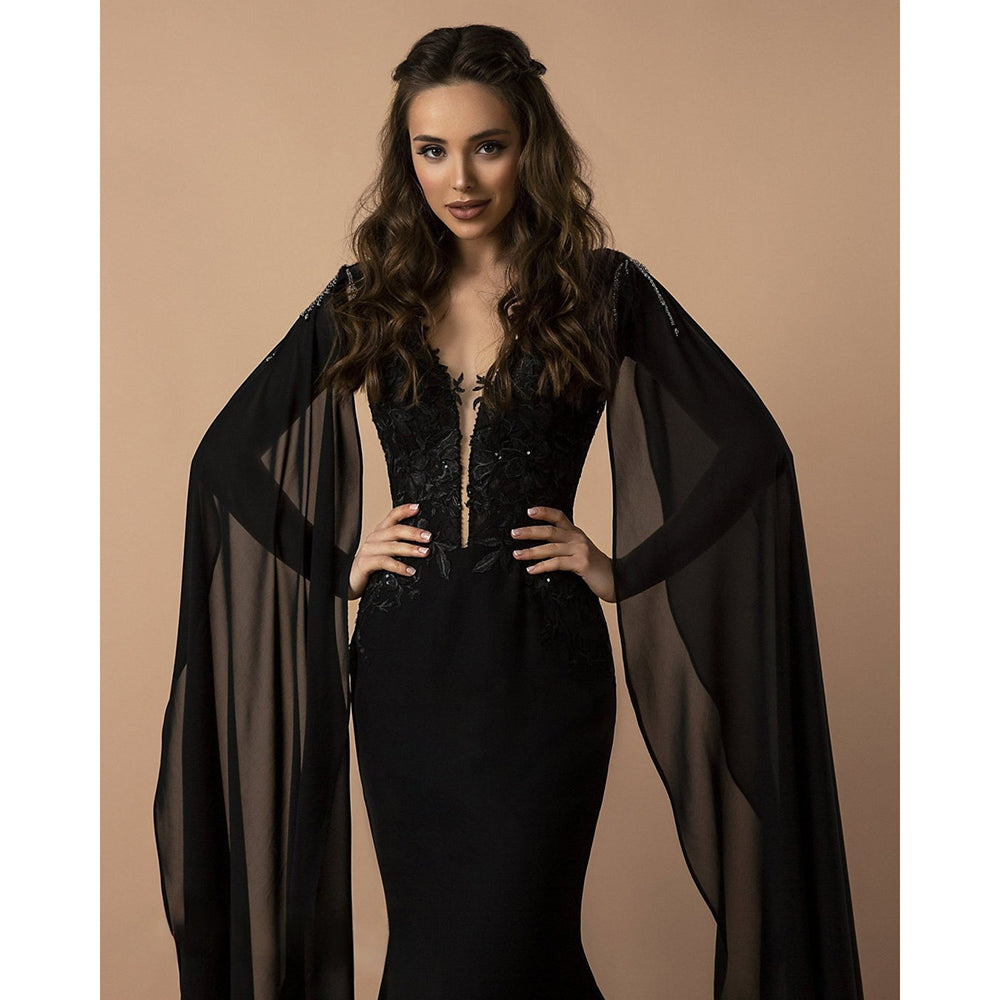 • Flowing Sleeves and Plunging Neckline Embroidery Mermaid Gothic Black Wedding Dress