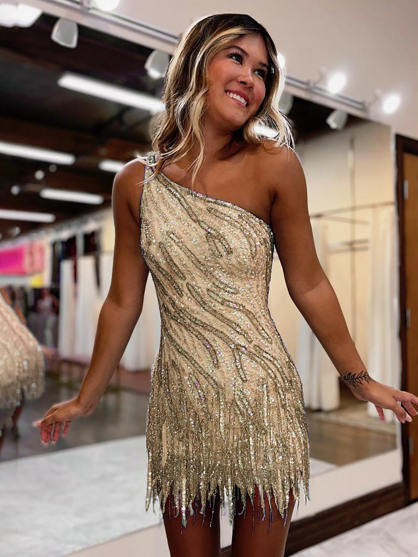 Isenia | Sparkly Blue One Shoulder Sequins Tight Short Hoco Dress with Fringes