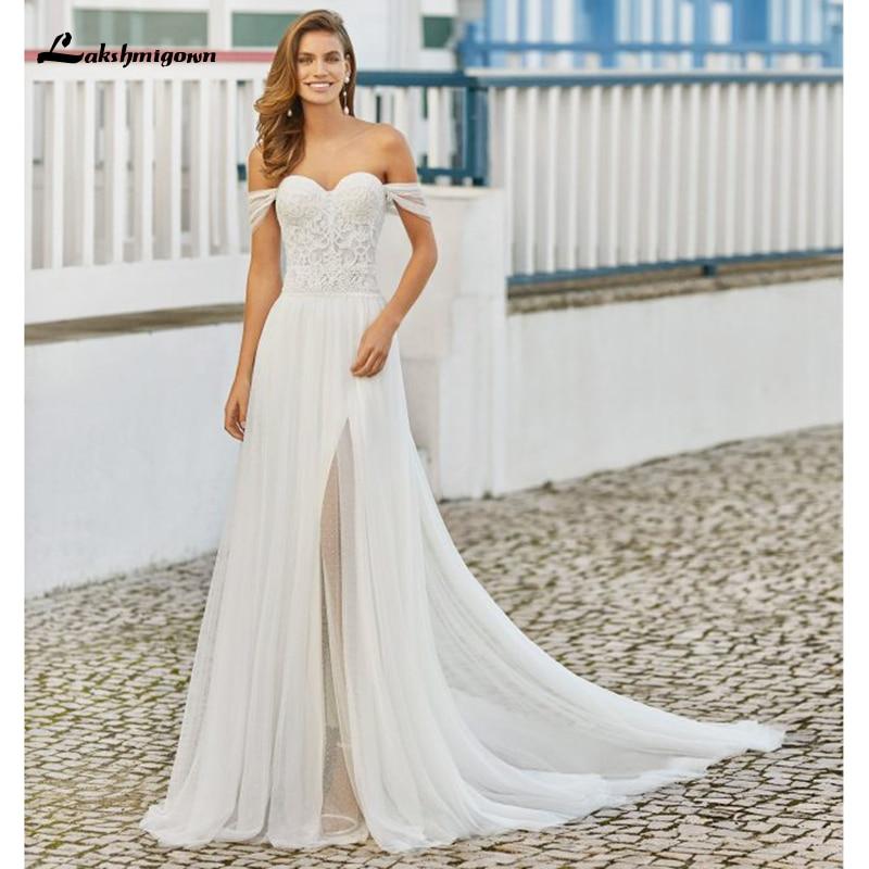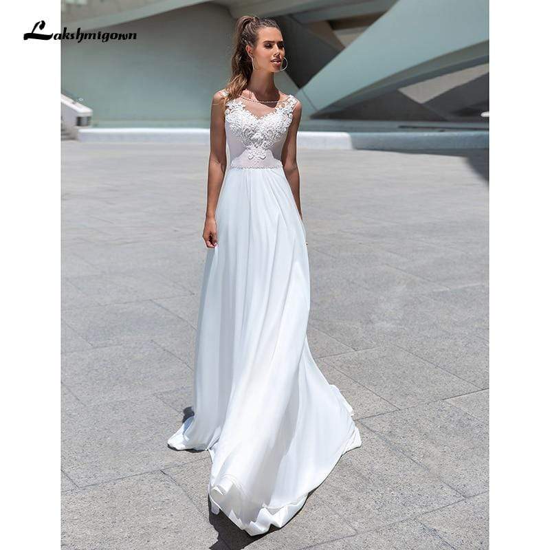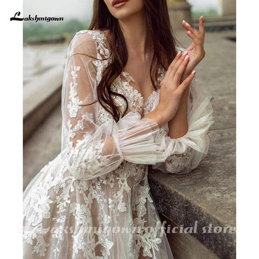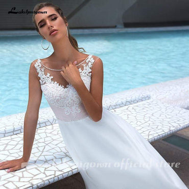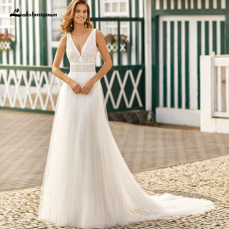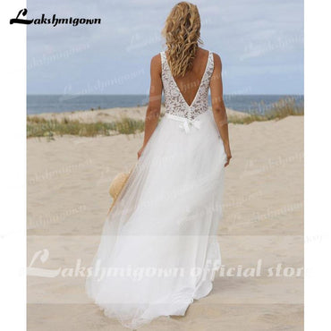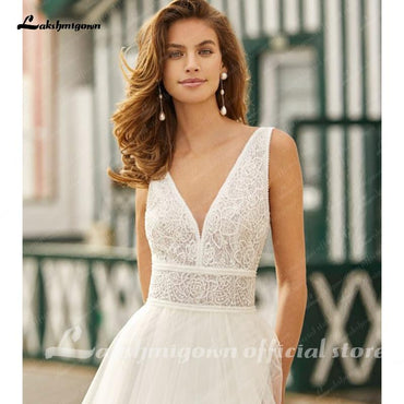Roycebridal Lakshmigown Charming Lace Appliqued Wedding Dresses Beach Bride Gowns V-Neck Sleeveless A-line Tulle Country Party Dresses
