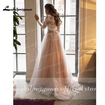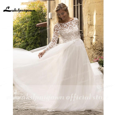 Roycebridal Long Sleeve Lace Open Back Tulle Beach Wedding Dresses