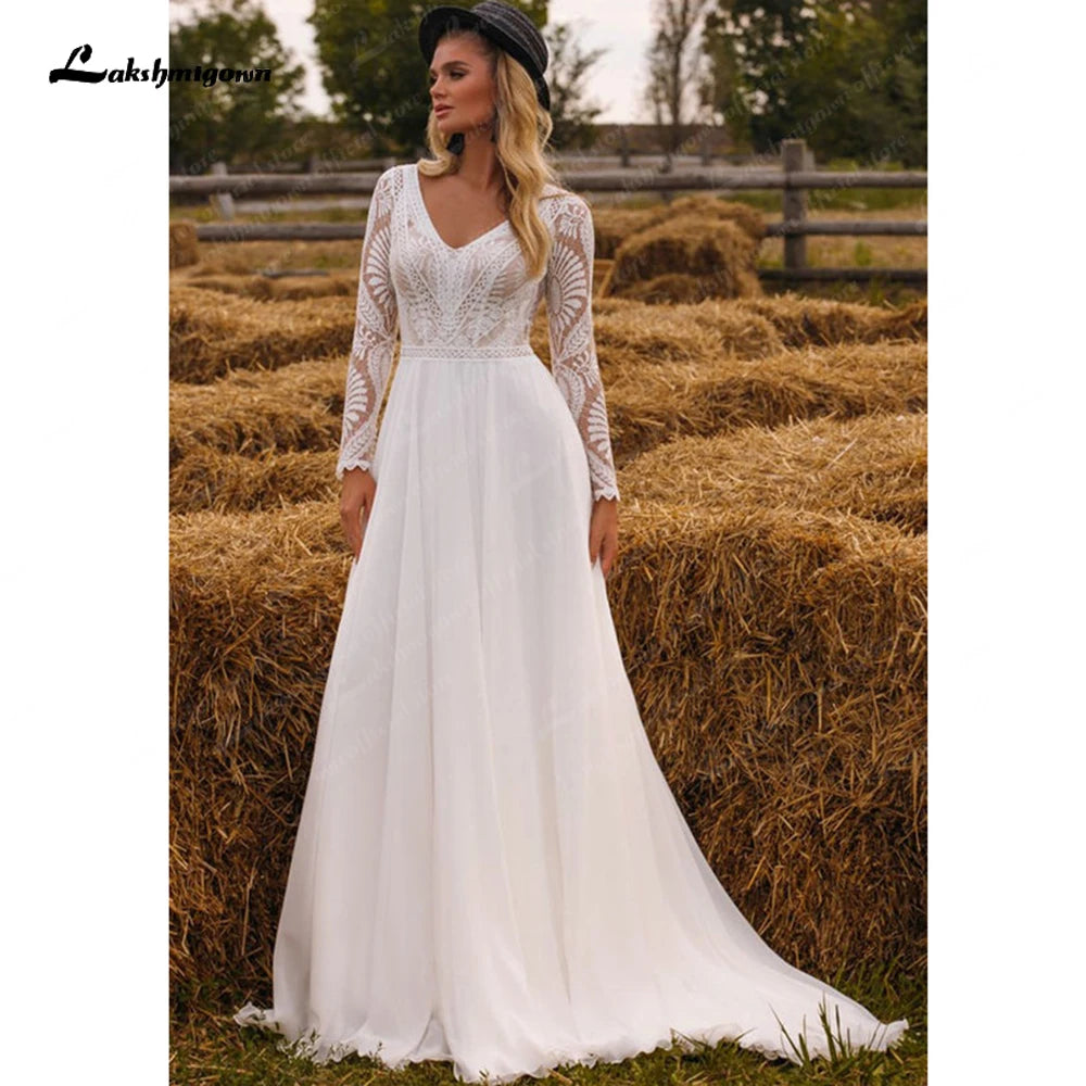 Chic Boho Long Sleeve V Neck Lace Bodice Chiffon Wedding Gown for Women 2024 Beach Bridal Wedding Dress