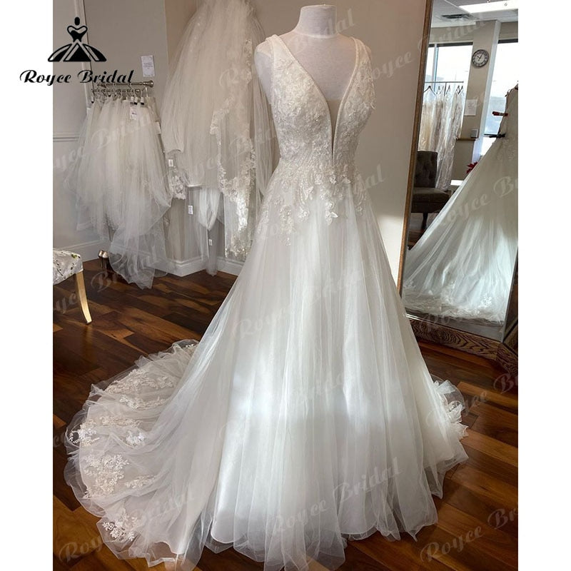 Roycebridal trouwjurk Champagne Wedding Dress Lace Bodice Applique Deep V Neck Lace Wedding Gown Custom Made Robe De Mariee Roycebridal