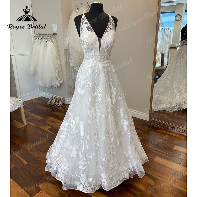 Roycebridal vestido rouwjurk Boho Wedding Dress Backless Lace Appliqued Sleeveless Sweep A Line Robe de Mariee Bridal Gown Custom Made