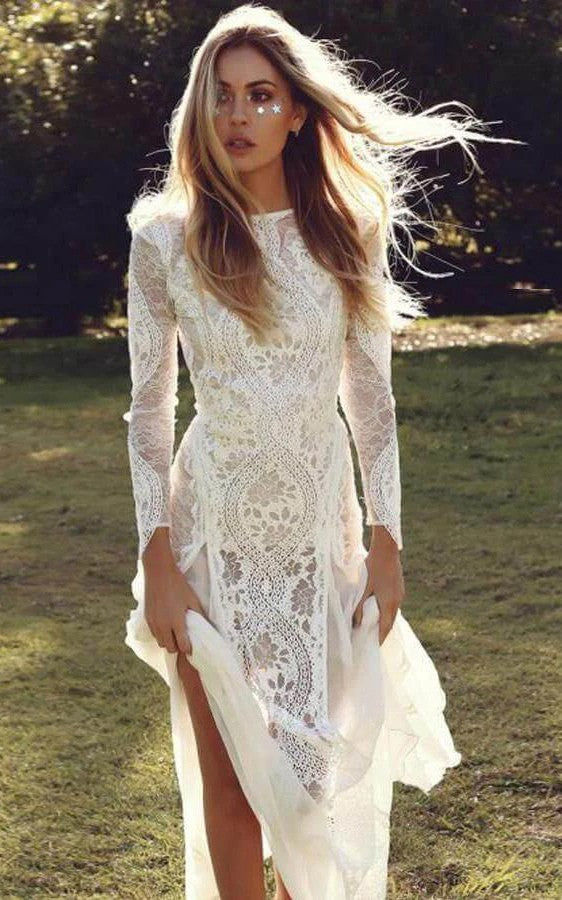 Vestido de Noiva Boho, Renda, Sem Costas, Manga Comprida, Silhueta Sereia, Feito à Medida Personalizado